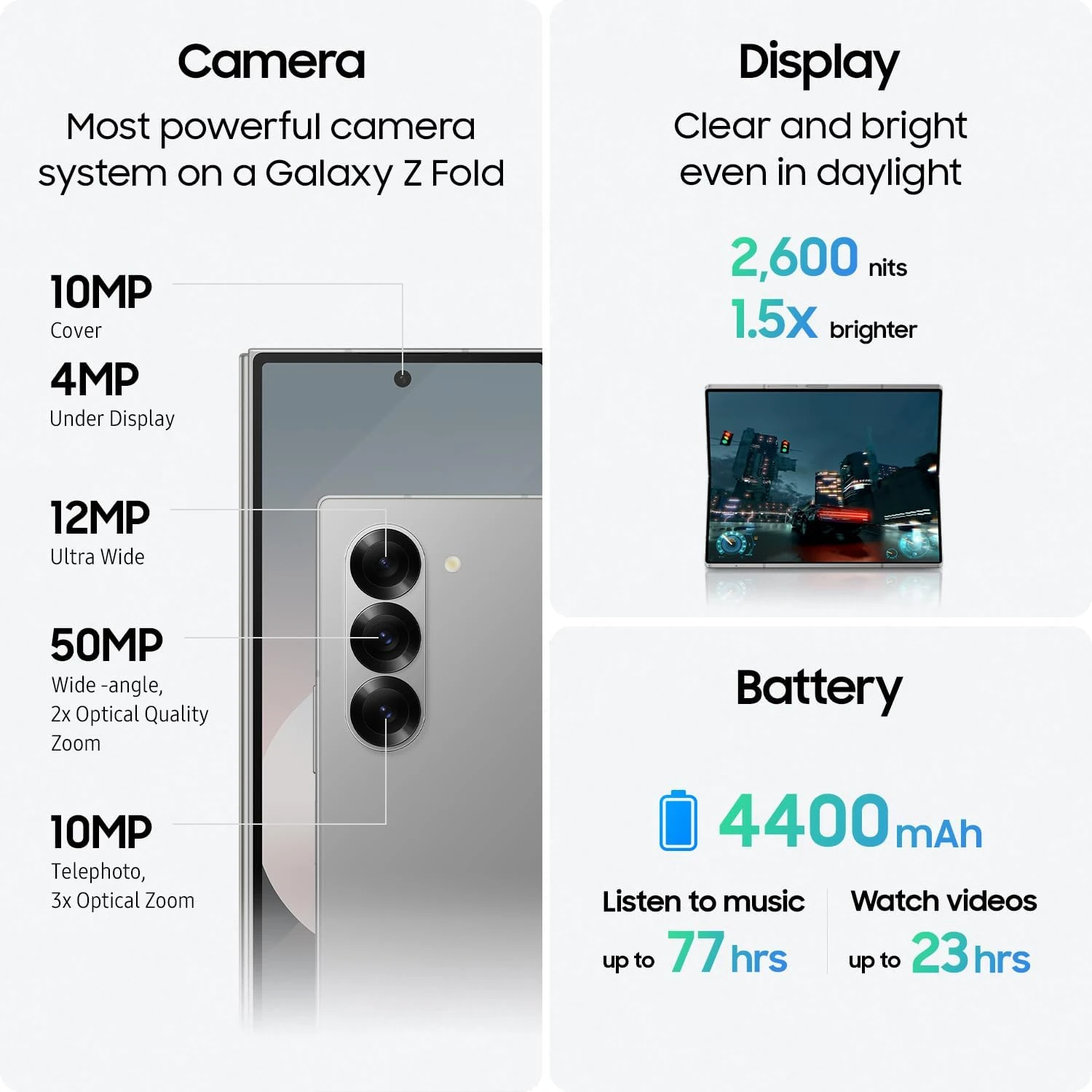 Camera: High-resolution multi-camera system with AI enhancementsBattery Life: Long-lasting battery with fast charging and wireless charging supportWater Resistance: IPX8 ratingGift Bundle: Includes a $300 Amazon Gift CardIn the Box:- Galaxy Z Fold 6 smartphone